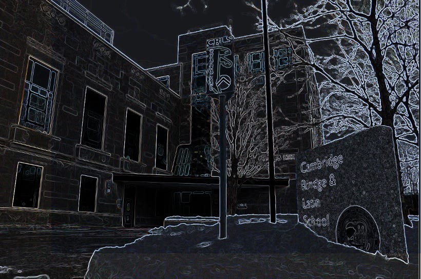 In honor of the snowstorm that’s slowly winding down outside my window, a chatty, musing poem inspired by the memory of a public meeting in the Cambridge Rindge and Latin School1 cafeteria that went very late (not so uncommon) on a very snowy night that, thankfully, preceded a snow day.